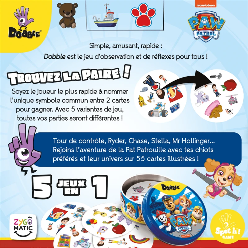 Entre deux cartes, il y a toujours exactement un symbole correspondant. Serez-vous le premier Ă le repĂ©rer dans le jeu addictif de lâobservation rapide ? Dans Dobble, il y a toujours un et un seul symbole identique entre chaque carte. Trouvez-le et vous gagnez ! 30 cartes, 5 mini-jeux.