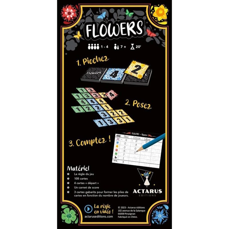 Flowers est un jeu de cartes abstrait simple et efficace dans lequel joueuses et joueurs doivent placer des cartes devant eux en formant des groupes de couleur et de valeur. Il se joue de 1 Ă 4, dĂšs 7 ans, pour des parties de 20 minutes environ.