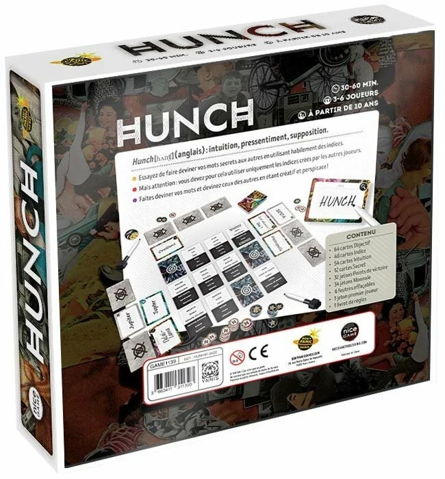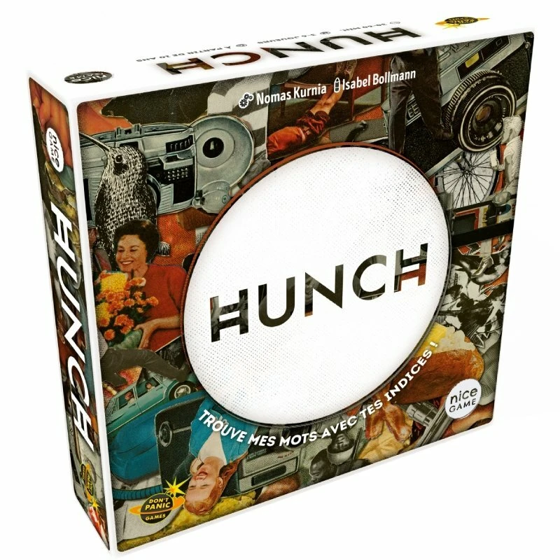 Hunch! est un jeu d’association d’idée et d’enchères où les joueurs se répartissent les indices qu’ils donnent par un système d’enchères. Il se joue de 3 à 6, dès 10 ans, pour des parties entre 30 et 60 minutes.