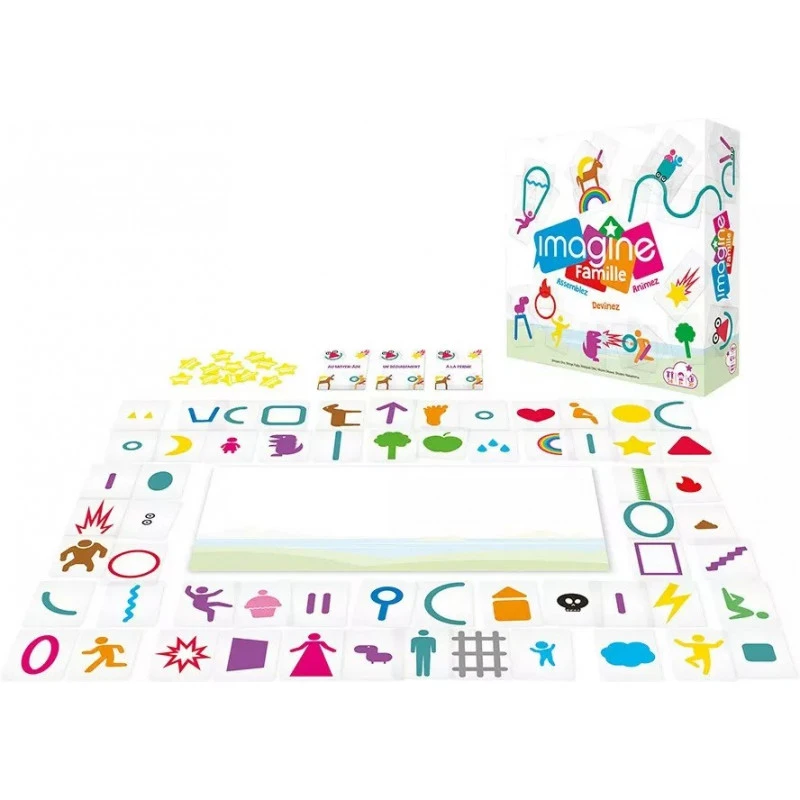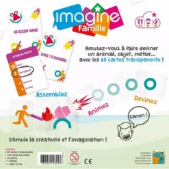 Imagine revient dans un format famille toujours aussi immédiat dans le divertissement et le plaisir : piochez une carte Devinette, choisissez un sujet parmi les cinq possibles, et faites-le deviner aux membres de votre équipe à l’aide des calques.