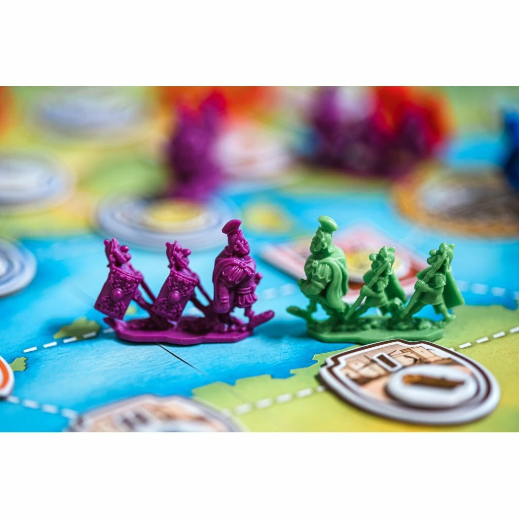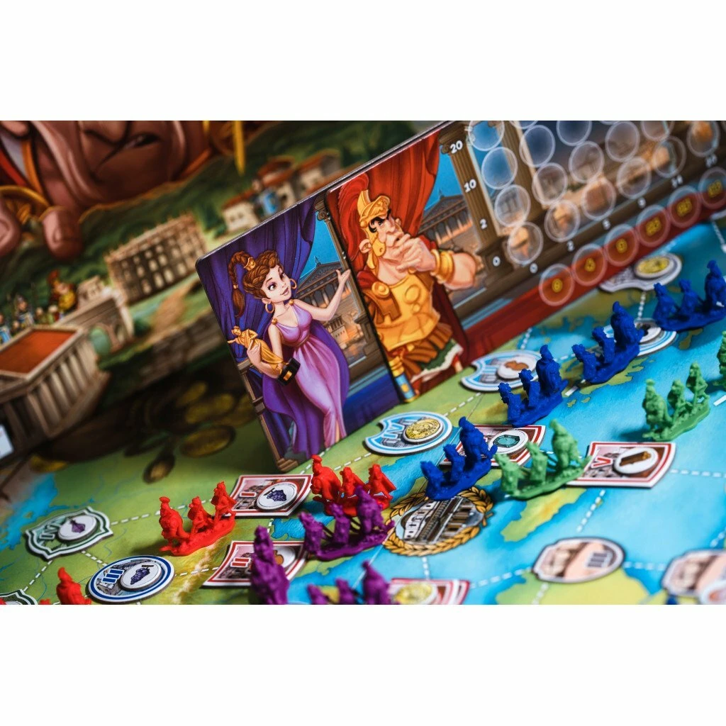 Dans l’Empire de César, vous devrez construire des routes afin de connecter Rome aux autres villes indiquées sur la carte. Vous gagnerez des points chaque fois que vous construisez une route. Chaque nouvelle ville que vous reliez à Rome vous permet d’amasser des jetons ville et des jetons richesses qui vous feront gagner des points supplémentaires à la fin de la partie. Celle-ci prend fin lorsque Rome est connectée à toutes les villes sur le plateau.