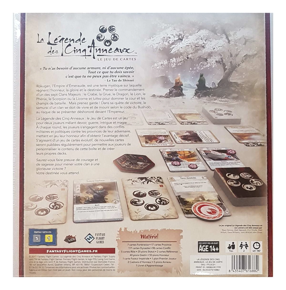 Le jeu de base de La Légende des Cinq Anneaux : le Jeu de Cartes inclut tout ce dont vous aurez besoin pour explorer les sept grands clans de Rokugan : le Can du Crabe, le Clan de la Grue, le Clan du Dragon, le Clan du Lion, le Clan du Phoenix, le Clan du Scorpion et le Clan de la Licorne. Il comprend également de nombreux pions et cartes, ainsi que les feuillets de règles qui vous permettront de jouer vos premières parties de La Légende des Cinq Anneaux : le Jeu de Cartes.