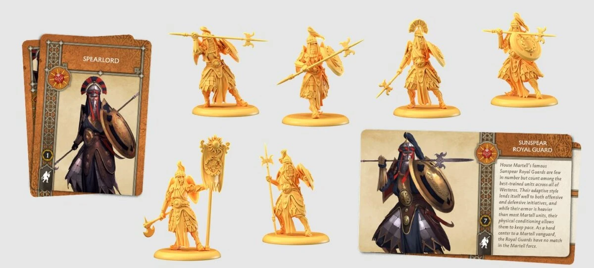 La maison Martell règne sur le désert, les plaines et les badlands du sud de Westeros sous la bannière de Lancehélion. Leurs troupes sont vêtues de robes du désert et d’armures légères, et se classent parmi les forces les plus rapides de la Guerre des Cinq Rois. La doctrine de combat de la Maison Martell est de frapper rapidement, de frapper fort et d’éviter la contre-attaque. Leurs lanciers et leurs tirailleurs forment le gros de leurs forces, tandis que les vipères des dunes jouent un rôle de flanc et d’épinglage.