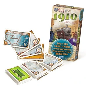 Les Aventuriers du Rail : USA 1910 est une nouvelle extension pour le jeu Les Aventuriers du Rail. Elle vous fera découvrir 181 cartes grand format (celui des cartes des versions Europe et MÀrklin) parmi lesquelles 39 nouvelles destinations, une nouvelle carte bonus « Globe Trotter » pour le joueur ayant réalisé le plus de destinations, et un paquet complet de cartes de remplacement du jeu original.