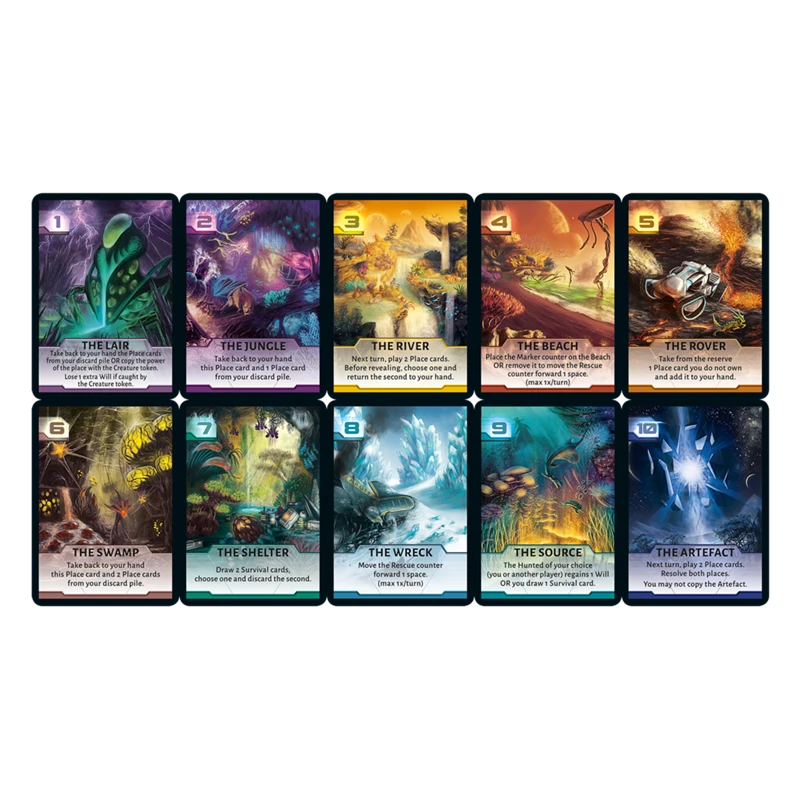 Si vous incarnez l’un des Naufragés, vous explorerez Artemia au moyen de cartes Lieux. Aidés de vos cartes Survie, vous tenterez de résister à la traque de la Créature jusqu’à l’arrivée des secours.