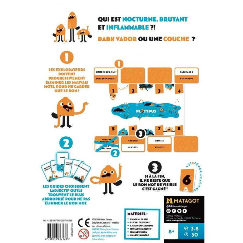 Pour cela, ils donnent des indices sous forme de cartes Adjectifs qui définissent le mieux pour eux le Platypus. Ces indices sont choisis dans leur main de 4 cartes. À chaque nouvel indice, les Explorateurs éliminent 1 ou 2 noms qui ne correspondent pas à la définition donnée. Le but est de trouver le Platypus en laissant visible la carte correspondante au nom cible. Une partie peut prendre fin de deux manières : lorsque l’équipe obtient son 4e Succès – dans ce cas, les joueurs ont battu le jeu – ou lorsque l’équipe élimine le Platypus.