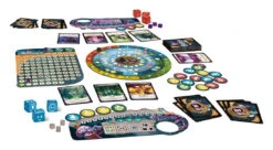 Contenu du jeu : – un plateau de jeu, une piste des cristaux, un marqueur année, un marqueur saison, 4 plateaux individuels, 8 jetons bibliothèque, 16 pions du sorcier, 20 dés des saisons de 4 couleurs différentes, 40 cartes pouvoir avancé, 60 cartes pouvoir de base, 64 jetons énergie, un livret de règles.