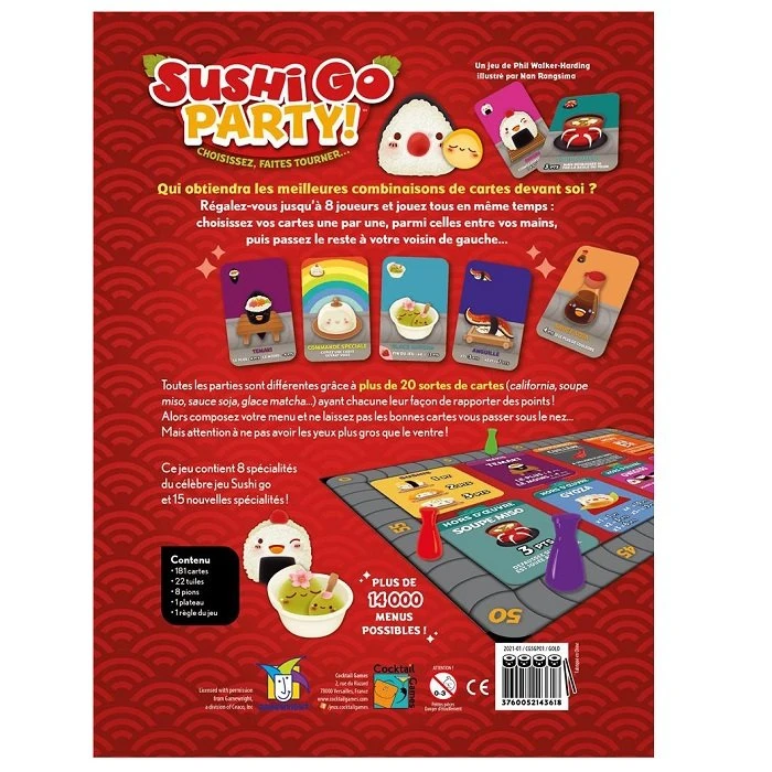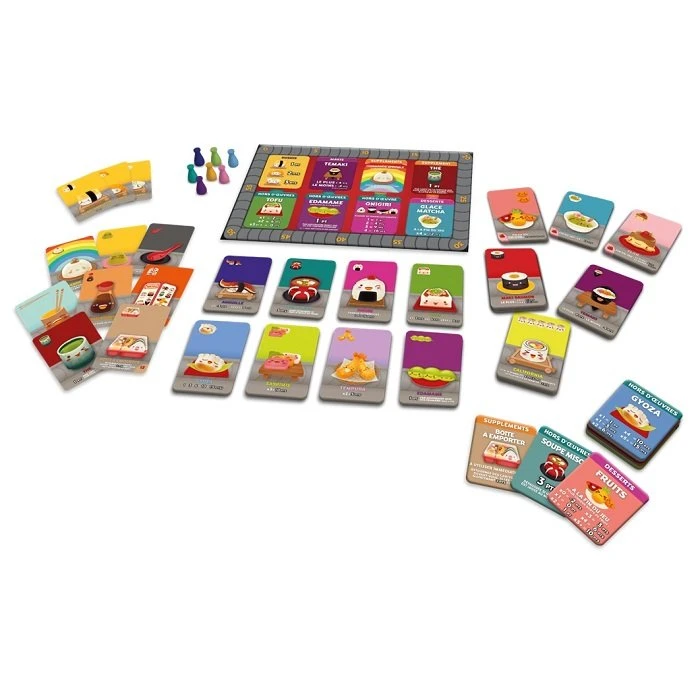 Toutes les parties sont différentes grâce à plus de 20 sortes de cartes (california, soupe miso, sauce soja, glace matcha…) ayant chacune leur façon de rapporter des points ! Alors composez votre menu et ne laissez pas les bonnes cartes vous passer sous le nez…