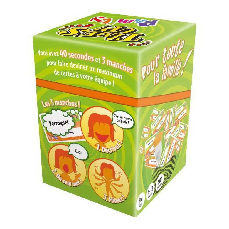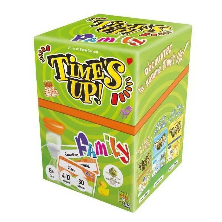 Avec Timeâs Up! Family, amusez-vous Ă dĂ©couvrir en famille ou entre copains des objets, des mĂ©tiers et des animaux. Les joueurs sont rĂ©partis en Ă©quipes et la partie se joue en 3 manches. Durant chaque manche, chaque Ă©quipe joue Ă tour de rĂŽle et doit deviner un maximum de mots du paquet de 30 cartes sĂ©lectionnĂ©es pour la partie.