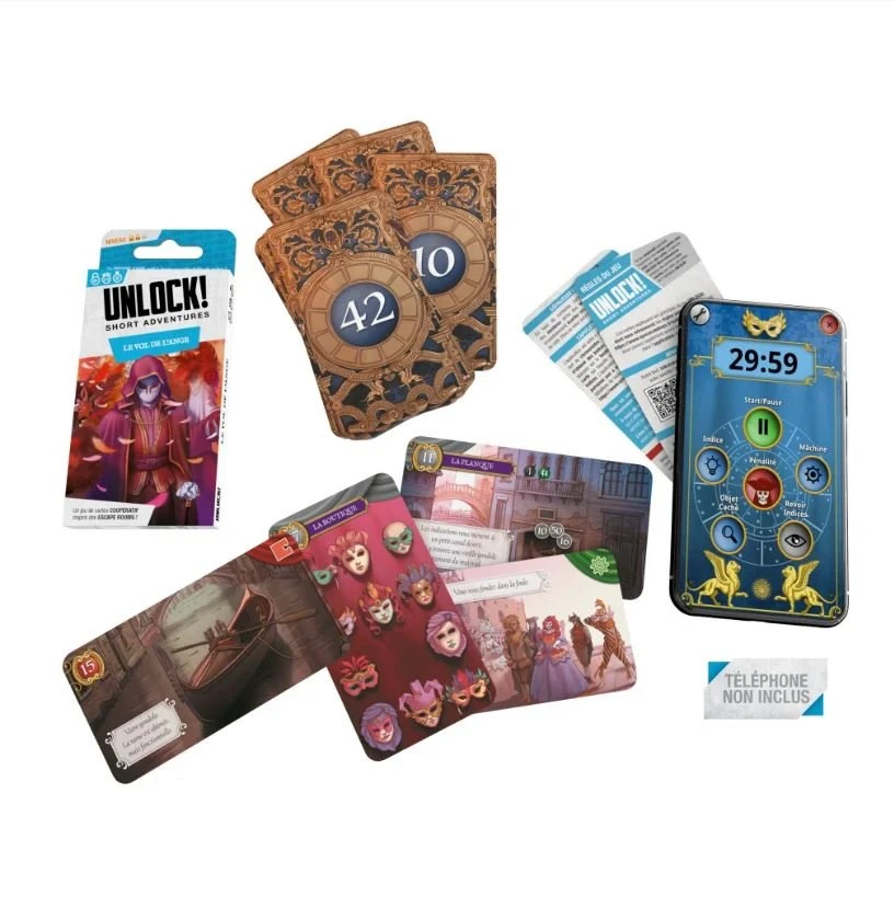 Unlock Short Adventures, ce sont des Unlock de 30 à 45 minutes en petit format, pratique à mettre dans la poche ou à offrir pour faire découvrir le jeu. Unlock ! est un jeu de carte coopératif inspiré des escape rooms. Unlock! vous fait vivre ces expériences chez vous, autour d’une table. Après avoir pris connaissance du contexte du scénario, vous commencez votre aventure dans une pièce (une carte de lieu qui indique divers numéros). Fouillez-la pour trouver des objets ! Attention : certains peuvent être cachés ! Des énigmes visuelles ou audio ralentissent votre progression. À vous de coopérer avec vos partenaires pour avancer et terminer dans les temps.