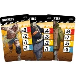 Contenu du jeu : 88 figurines (12 survivants, 40 rôdeurs, 16 balèzes, 16 forcenés, 4 abominations), 6 socles colorés de survivants, 6 tableaux de bord de survivant, 12 fiches d’identité de survivant, 107 mini-cartes (63 cartes équipement, 40 cartes zombies, 4 cartes abomination), 9 dalles recto-verso, 6 dés, 48 pointeurs, 71 pions, 1 livret de règles.